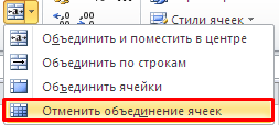 Для отмены объединения ячеек в Excel 2010 тоже есть специальная кнопка. Выделяем объединенную ячейку, и жмем на эту самую кнопку.