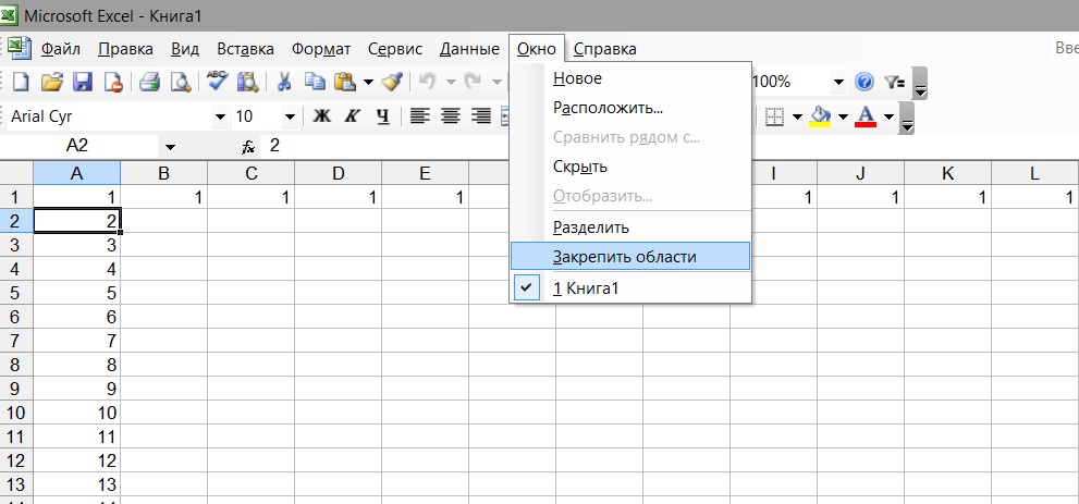 Обратите внимание, для фиксирования первой строки активной должна быть ячейка А2.