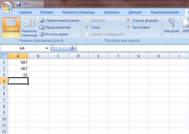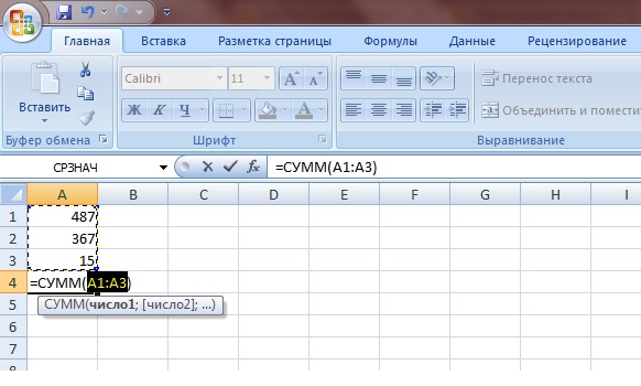 Вносим в первую ячейку А1 число 487, в ячейку А2 число 367, в ячейку А3 цифру 15. И так у нас получился столбик из трех слагаемых.